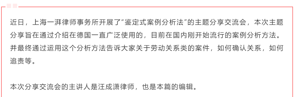 我首先通过与判决式案例分析法的比较,讲解了鉴定式案例分析法的定义,之后通过两个小案例以民刑结合的方式分析了鉴定式案例分析法的重要性,从简单到复杂,再从复杂到简单的,讲解了鉴定式案例分析的理解与运用。最后通过一系列的案例,运用鉴定式案例分析法,针对目前疫情期间常遇到的劳动官司中劳动关系的认定以及责任问题做了总结与分享。