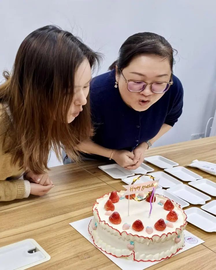 3月20日下午,众多一湃同仁齐聚一堂,共度美好时光。两位寿星的生日比邻,仅一日之隔,双生连庆,也是一段特别的缘分。为了给寿星们一个难忘的生日回忆,行政部特别准备了一个精致可爱的草莓蛋糕。当熟悉的生日歌旋律响起,全体同事的歌声交织在一起,汇聚成温暖的祝福。寿星们在大家热烈的掌声中闭上眼睛,默默许下心愿,而后一起吹灭蜡烛,在大家一边品尝着美味的蛋糕,一边分享着生活的趣事与工作的点滴,欢声笑语回荡在整个会议室。